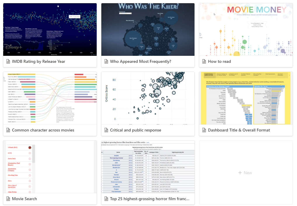 How about taking a look at what other people are visualizing for movies? So I went to look at Tableau Public Gallery, focusing on the Film and TV section. A world of possibilities suddenly opened up to me. Since not much time left, I just gotta find a shortcut. So I took screenshots of those designs I like and placed them into a common depository. Below is what I did in Notion, my trusted all-in-one workspace. But you might want to open a PowerPoint blank slide and start pasting some pictures inside.