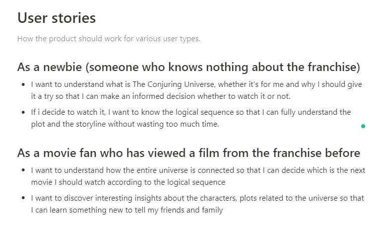 Confession time: I am a fan of user stories. No, I am not talking about long-winded product reviews. What I mean is several short and sweet sentence following a general structure like “As a [end user role], I want [ability or feature of the product] because [of whatever benefits I can gain or hassle I can avoid].” You may usually find user stories being used to capture functionalities for software products. But I personally find user stories extremely effective to make sure users come first in whatever I am working on. Here is what I wrote for The Conjuring Universe storyboard.