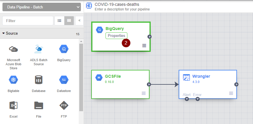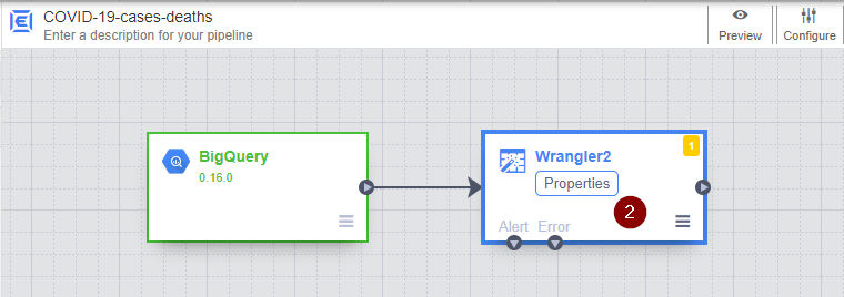 - To connect 2 nodes together, drag the connection arrow on the right edge of the BigQuery node and drop on the new Wrangler node. Hover over the new Wrangler node and click Properties.