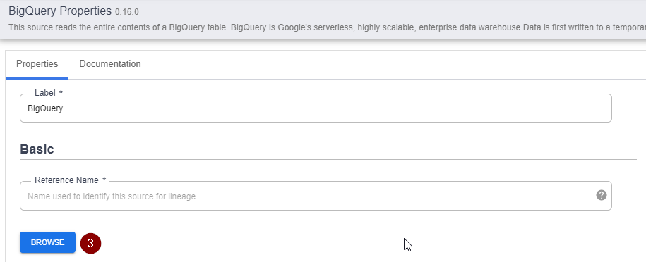 - Once the new node for BigQuery source appears, hover over the BigQuery node and click Properties.
