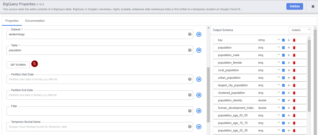 - To validate whether the BigQuery table contains the correct information that you are looking for, click Get Schema. All columns of the BigQuery table will appear on the right side of the wizard for your review.