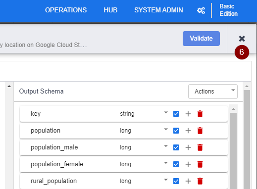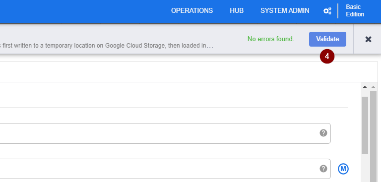- To ensure all things are specified correctly, click Validate. Once you see that No errors found, click the X button in the top right corner to exit the BigQuery properties and go back to the data pipeline.