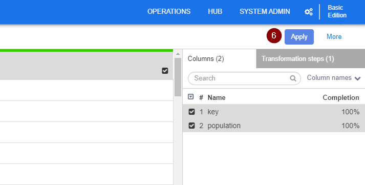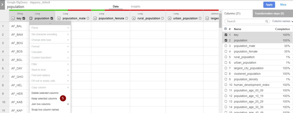 - With this population dataset, we only need the “key” and “population” column. Therefore, similar to how we eliminate redundant columns for the CSV file, at the menu to the right, tick the box(es) to select the Columns that you want to retain. Then click the Down arrow next to any of the selected column and click Keep selected column.