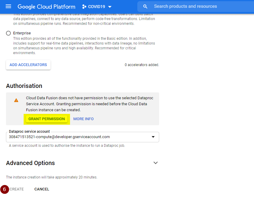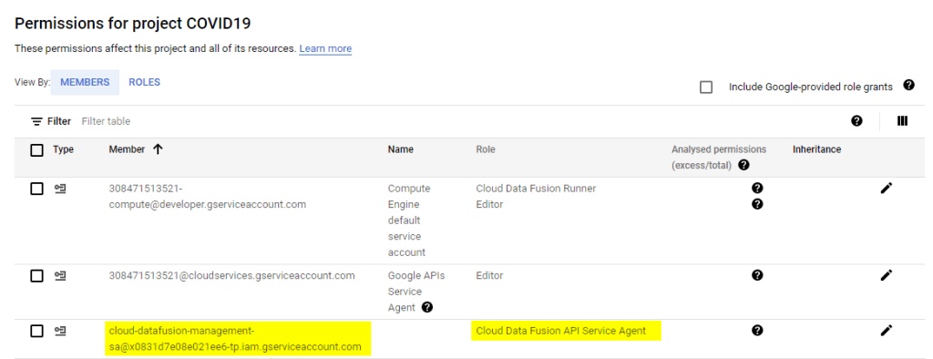 - Before proceeding any further please ensure that the service account associated with the newly created Data Fusion instance is visible as one of the granted permissions for your project (similar to the picture below).