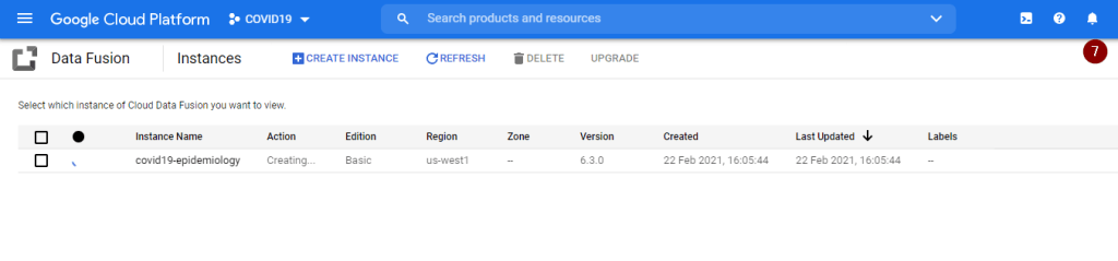 - Upon clicking Create, the instance creation process might take about 15-20 minutes. Once creation is completed, you will receive a Notification where the bell button is.