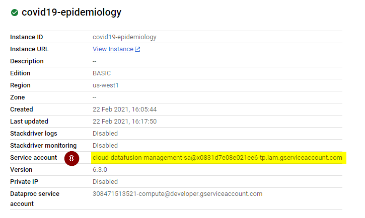 - Once the instance is created, let’s grant the service account associated with the new Data Fusion instance permissions on your project. To proceed, click the instance name (not the View Instance) and copy the Service Account to your clipboard.