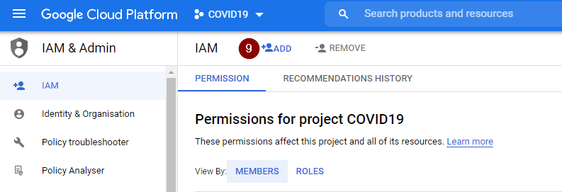 - Go to Navigation Menu > IAM & Admin > IAM, click Add.