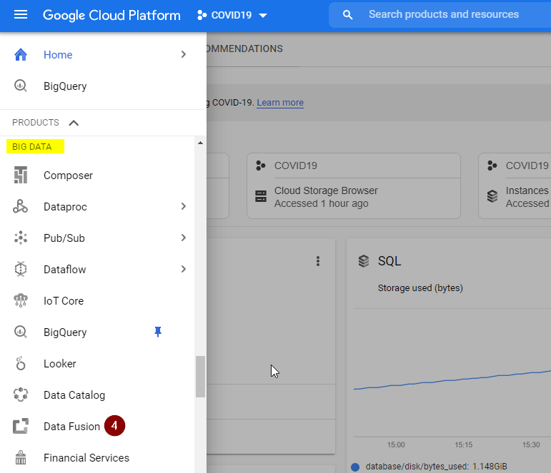 - Refresh the page and select the Navigation Menu. Scroll down all the way to BIG DATA and select Data Fusion.