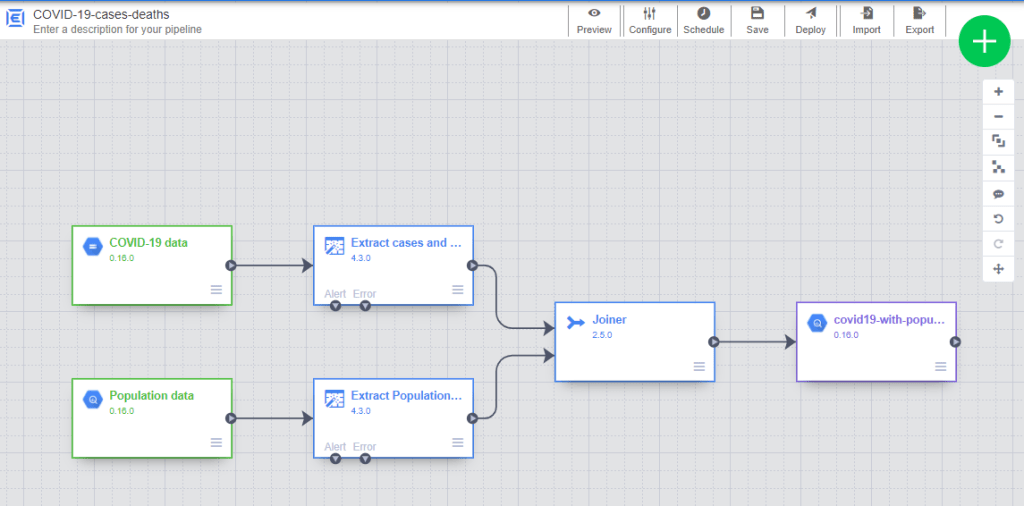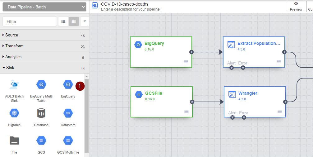 Unfortunately, information about number of cases and deaths doesn’t include population data. Therefore, we will build an ETL pipeline to combine a CSV file file (having the total number of cases and deaths) with a BigQuery table (containing population per country) using Cloud Data Fusion.
