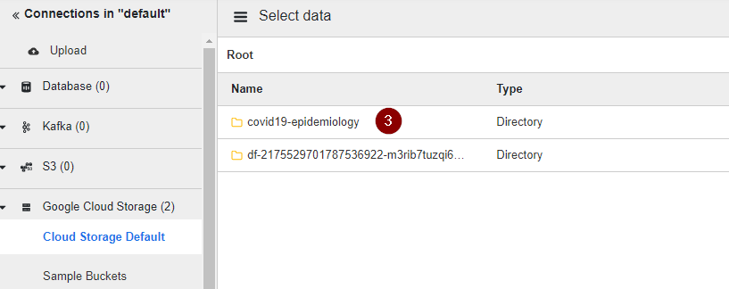 - Let’s load the CSV dataset into the pipeline by selecting the Cloud Storage Default on the left side, and clicking on the name of the bucket containing the number of cases and deaths per country over time.