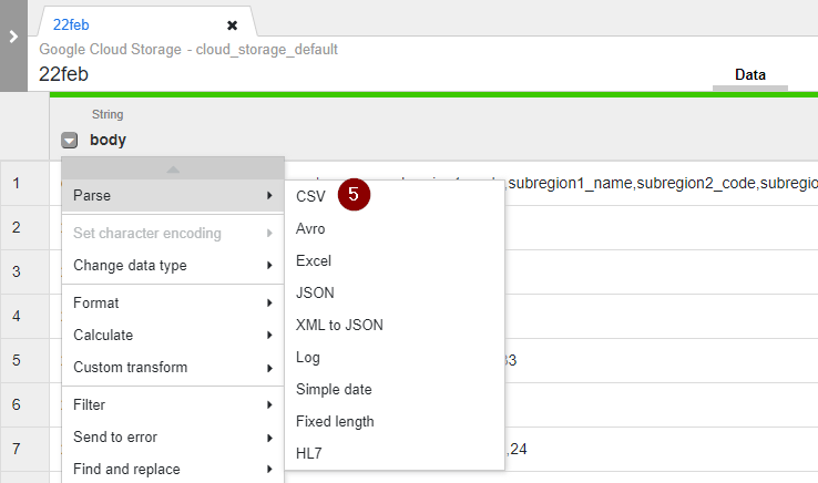- Once the data from CSV is loaded, you may notice that all attributes are combined under the same body column. So we will have to parse the CSV data into proper columns. Click the Down arrow located on the left of the body column and select Parse > CSV.