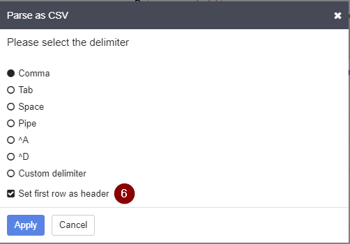 - Select the appropriate delimiter and tick the box for Select first row as header. Then click Apply.
