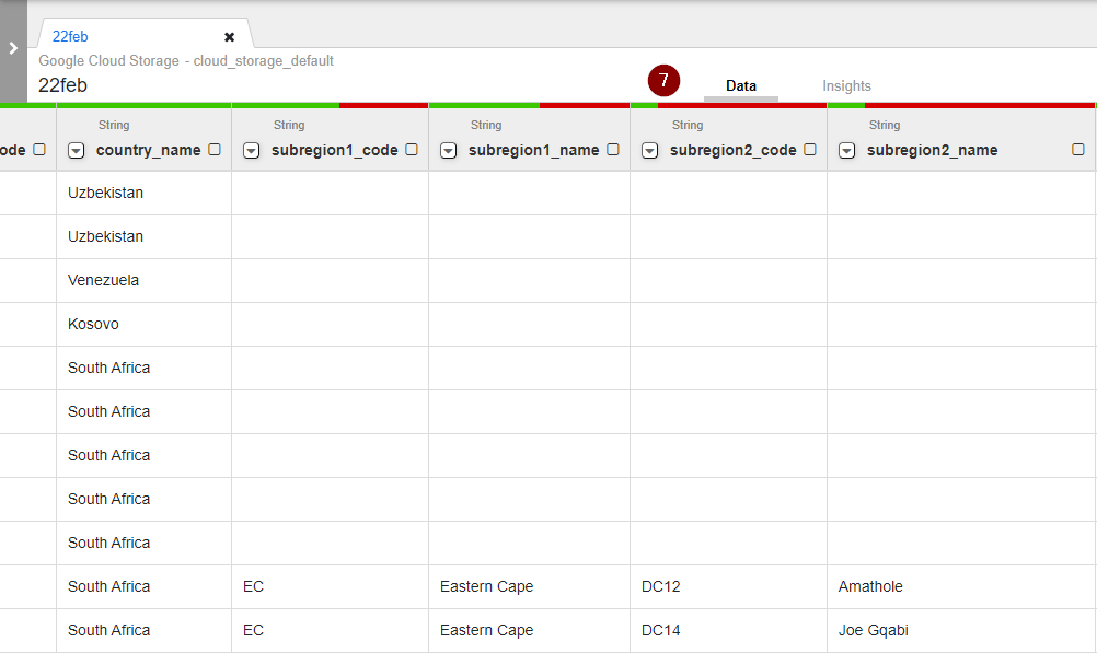 - As different attributes are split into their respective columns, we may now start exploring our dataset. Take a look at the screenshot below. Can you guess why some columns such as country_name are all green while subregion2_code shows a bit of green and the majority is red?