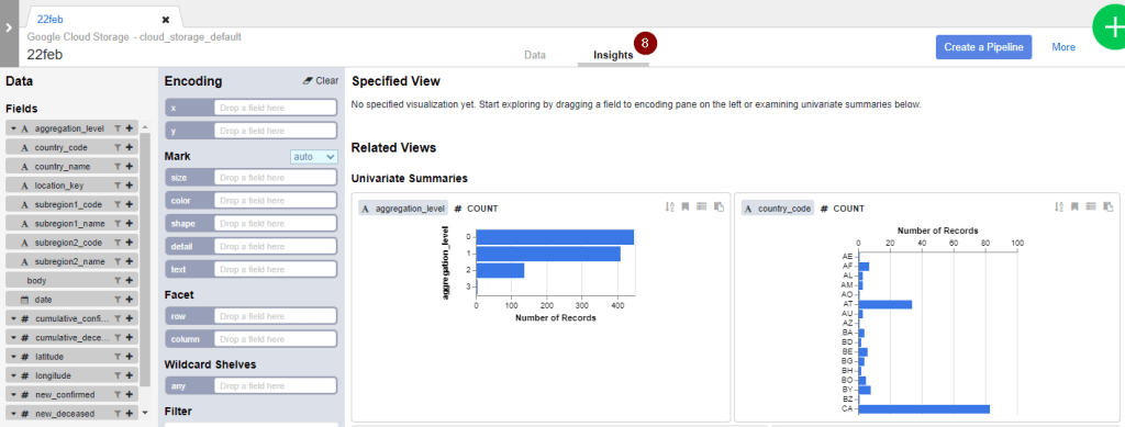- Another useful feature to explore the data in a more visual way is with Insights. For example, here I can easily observe that this data set contains different levels of aggregations from 0 to 3. This is something I have to handle with care since I am only interested in country-level figures instead of subregion-level figures.