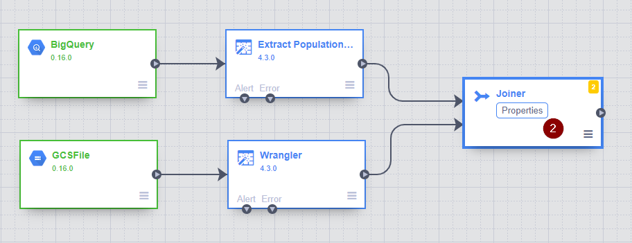 - Once the new Joiner node appears on the screen, connect the two Wrangler nodes to the Joiner node by drag and drop the connection arrow. Then hover over the Joiner node and click Properties to configure how the 2 tables should be joined together.