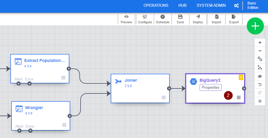 - Click the X button in the top right corner to exit the BigQuery properties and go back to the data pipeline.