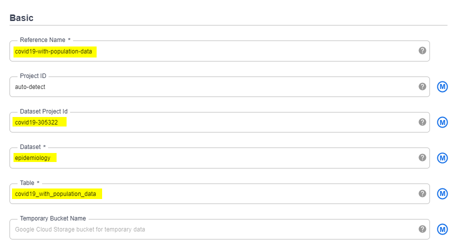 - Specify the Reference Name, Project ID, Dataset and Table that you want to store the combined dataset.