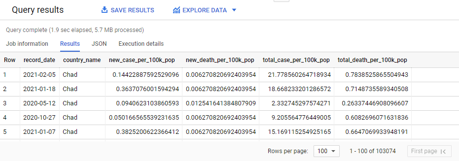 Since COVID-19 data and population data is now nicely stitched together in one place, writing a SQL query to calculate total number of cases and deaths per 100,000 populations over time can’t be any simpler.