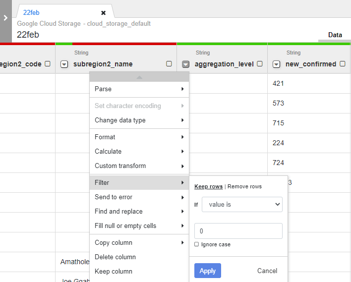To retain only country-level figures, click the Down arrow next to the aggregation_level column and filter to keep rows with aggregation_level = 0