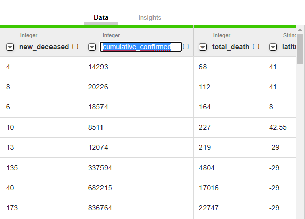 To change the original column name into a more intuitive one (for example from cumulative_confirmed to total_case), double-click on the column header, type the new name and press Enter.